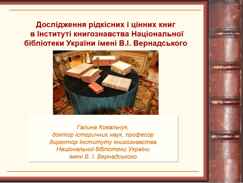 До участі в обговоренні цієї тематики була запрошена директор Інституту книгознавства Національної бібліотеки України імені В.І. Вернадського доктор історичних наук Галина Іванівна Ковальчук. Вона виступила на заході з доповіддю «Дослідження рідкісних і цінних книг в Інституті книгознавства Національної бібліотеки України імені В.І. Вернадського».