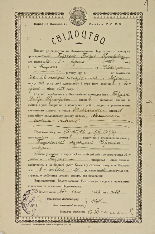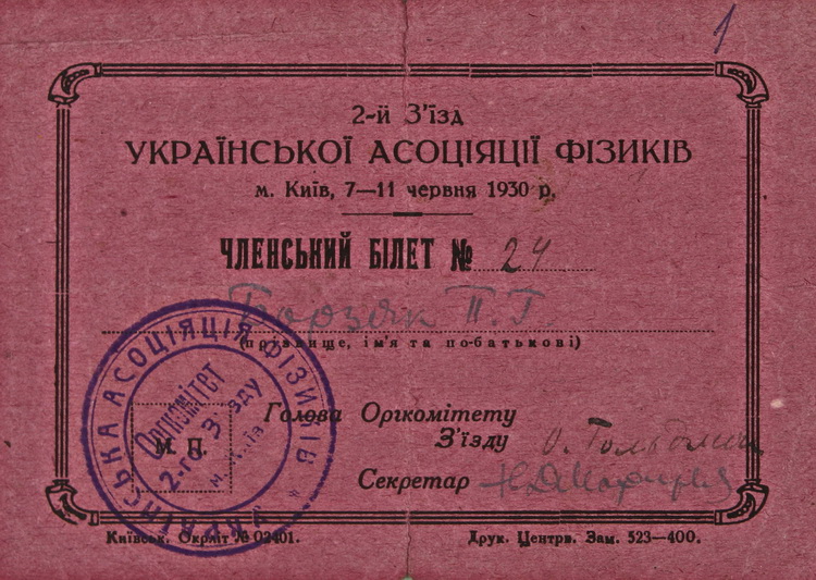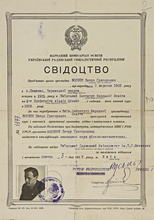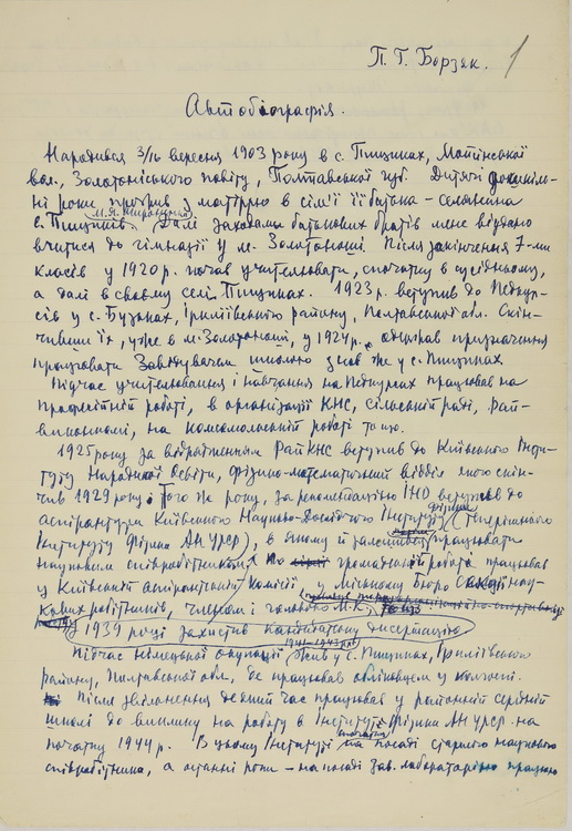 З документів біографічного характеру на виставці репрезентовано автобіографію (1959), свідоцтво про закінчення Золотоніського педагогічного технікуму (1928), членський квиток учасника 2-го з’їзду Української асоціації фізиків (1930), посвідчення про проходження аспірантського стажу, перебування на посаді старшого наукового співробітника і вченого секретаря Інституту фізики ВУАН (1933), свідоцтво про закінчення Київського інституту народної освіти (1939), витяг з протоколу засідання вченої ради фізико-математичного факультету Київського державного університету ім. Т. Г. Шевченка про присудження наукового ступеня кандидата фізико-математичних наук (1939), характеристику як старшого наукового співробітника Інституту фізики АН УРСР (1945), посвідчення про присвоєння почесного звання «Заслужений діяч науки Української РСР» (1978).
