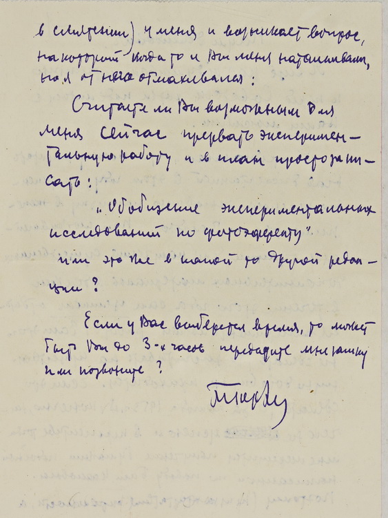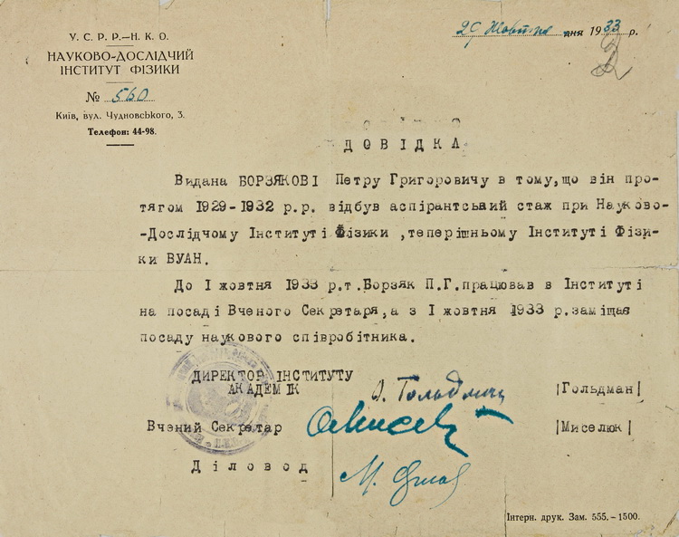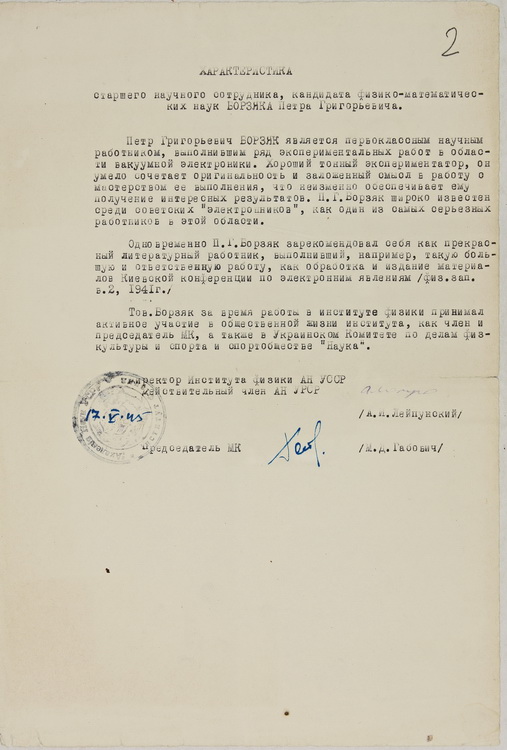 З епістолярних документів на виставці вміщено лист П. Г. Борзяка до його наукового керівника, члена-кореспондента АН УРСР, завідувача відділу Інституту фізики АН УРСР Н. Д. Моргуліса (1952).