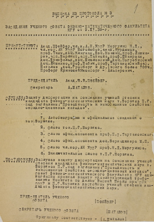 9 листопада 1939 р. учений захистив кандидатську дисертацію на тему «Провідність і емісійні властивості оксидно-цезієвих катодів» і отримав науковий ступінь кандидата фізико-математичних наук.