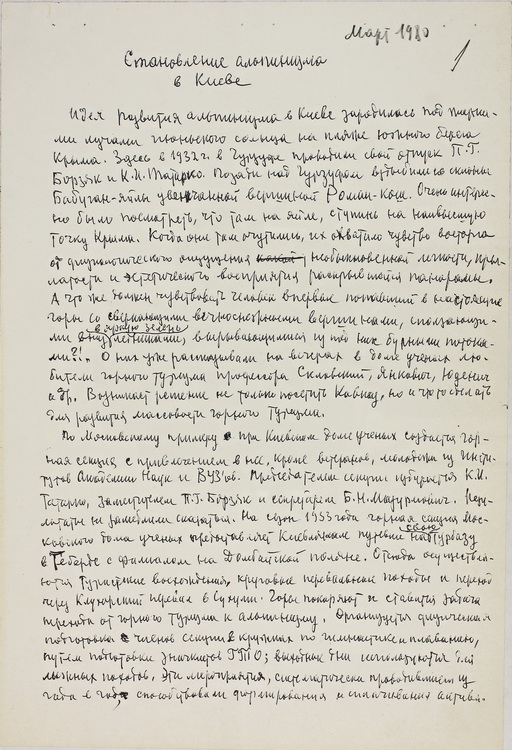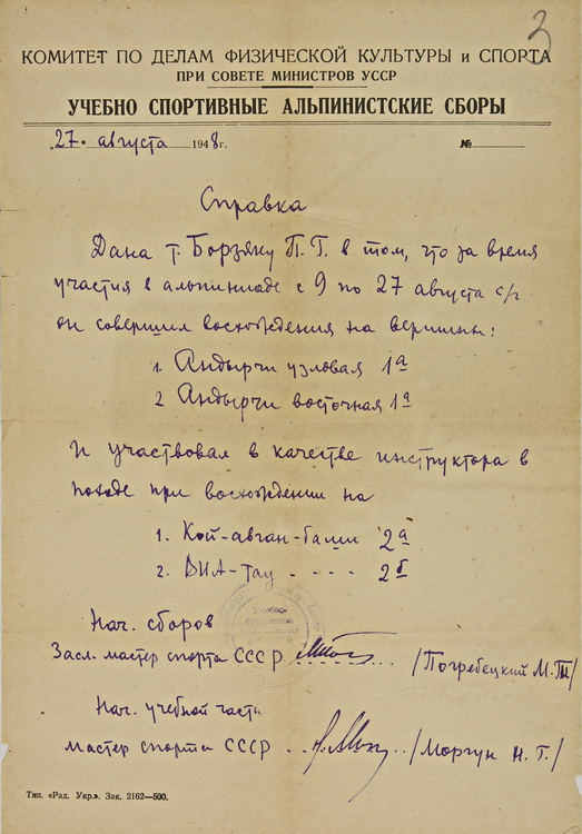 П. Г. Борзяк був членом спортивного товариства «Наука» і захоплювався спортивним альпінізмом. На виставці представлено його статтю «Альпінізм і бюрократи від фізкультури» (1937), довідку Комітету у справах фізичної культури та спорту при РМ УРСР про участь вченого в учбово-спортивних альпіністських зборах (1948), а також схему та анотацію «Домбайська панорама», складені П. Г. Борзяком у1960-х рр. Експонуються спогади ученого «Становлення альпінізму в Києві» (1980).