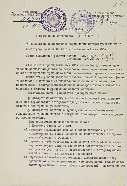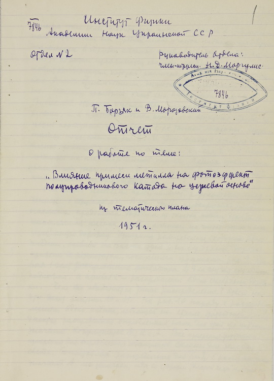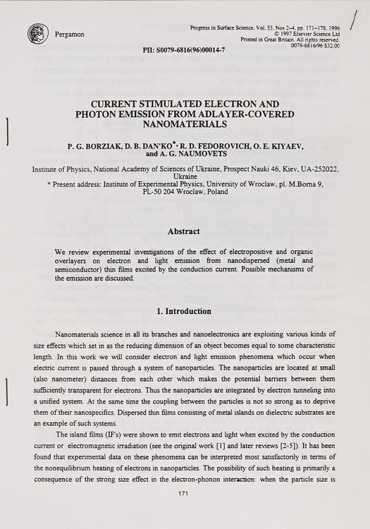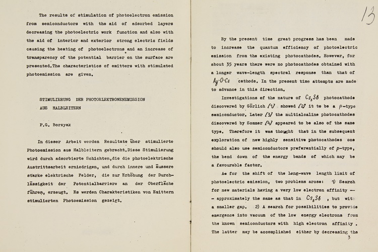 У експозиції виставки представлено наукові праці члена-кореспондента НАН України П. Г. Борзяка: статті «Про збільшення чутливості Cs3Sb-фотокатодів оптичними методами» (1958), «Stimulation of photoelectric emission from semiconductors» (1969), «Чарівна лабораторія» (1960-ті), «Current stimulated electron and photon emission from adlayer-covered nanomaterials» (1996) та авторське свідоцтво № 168371 на винахід «Автофотокатод» (1964).