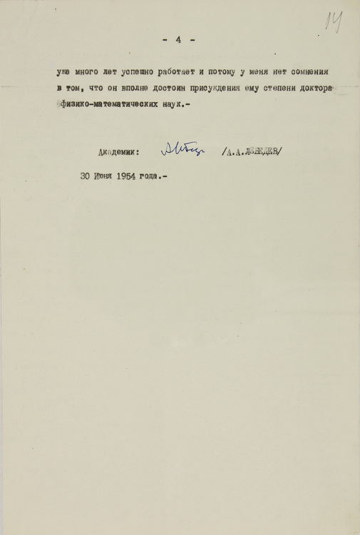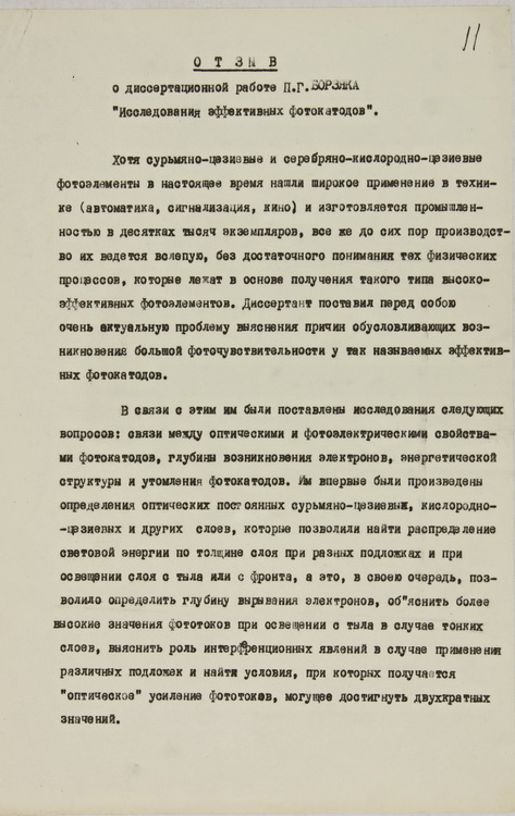 Документи про вченого представлено відгуком академіка АН СРСР О. О. Лебедєва на докторську дисертацію П. Г. Борзяка «Дослідження ефективних фотокатодів» (1954).