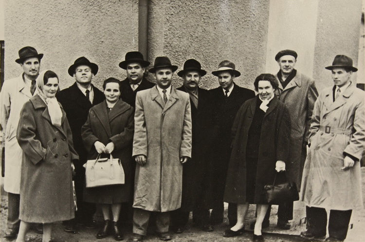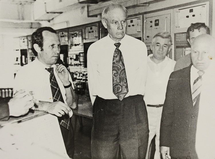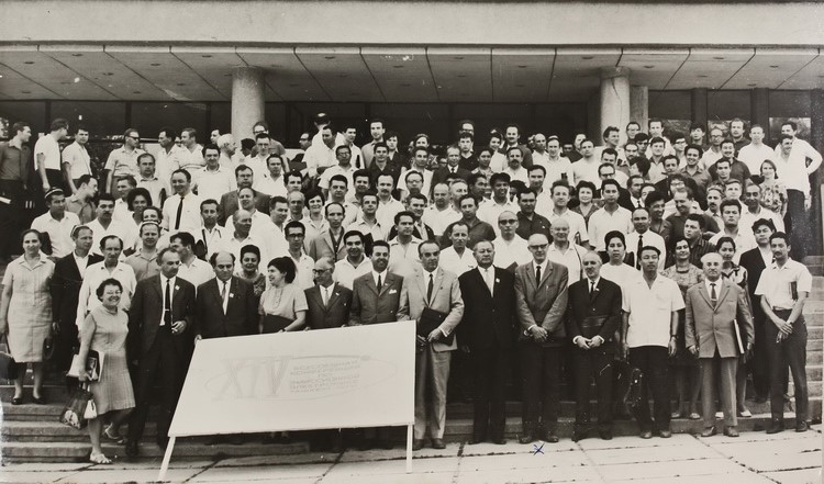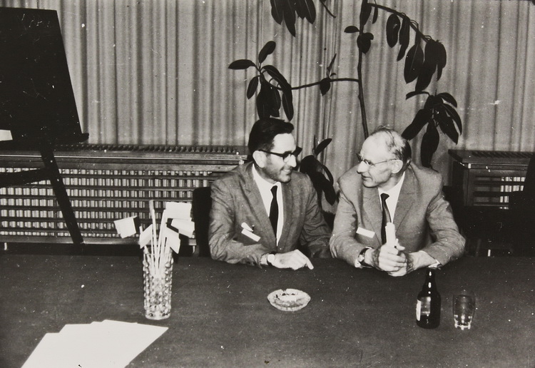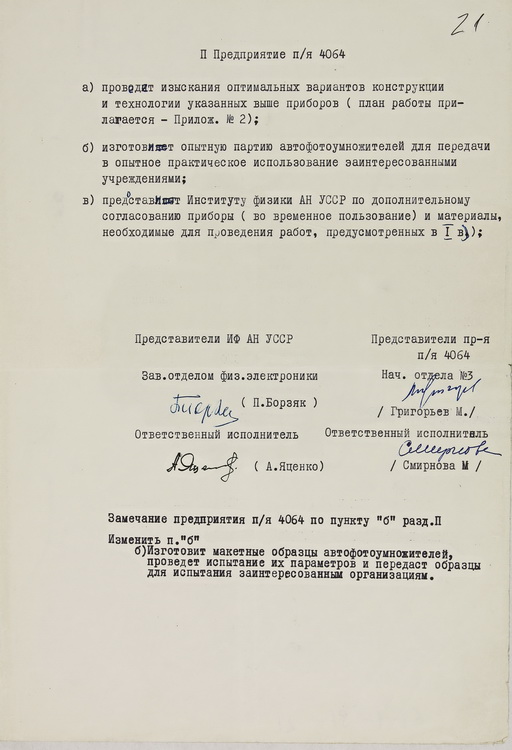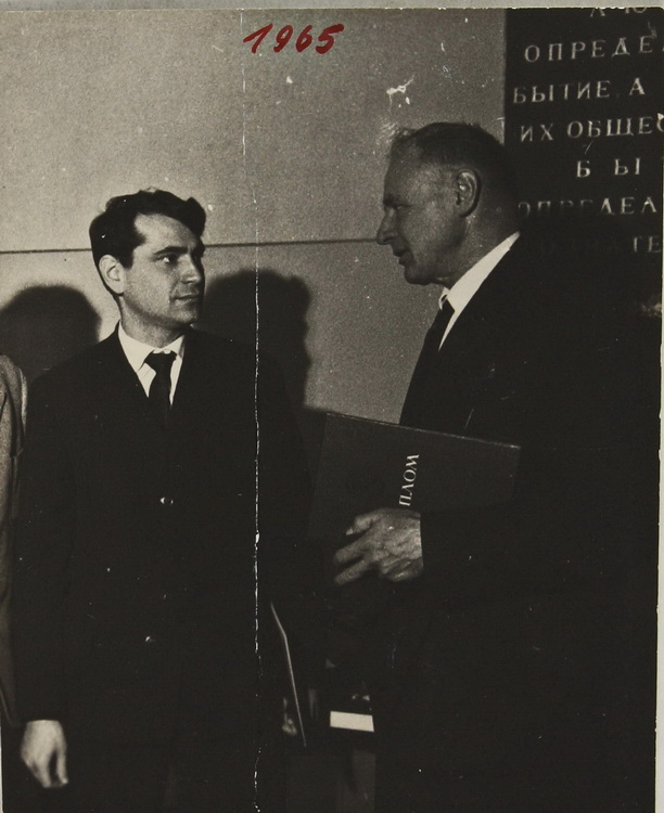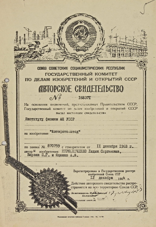 Вміщено світлину, на якій завідувача відділу фізичної електроніки Інституту фізики АН УРСР П. Г. Борзяка зафіксовано поруч із старшим науковим співробітником Інституту О. Г. Сарбеєм після вручення диплому за науковий винахід явища холодної електронної емісії шляхом пропускання струму крізь тонкі острівкові металеві плівки (1965).
