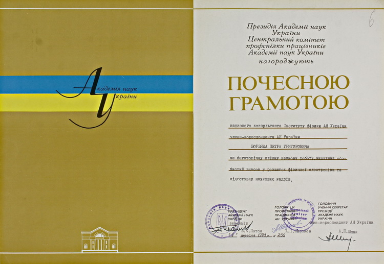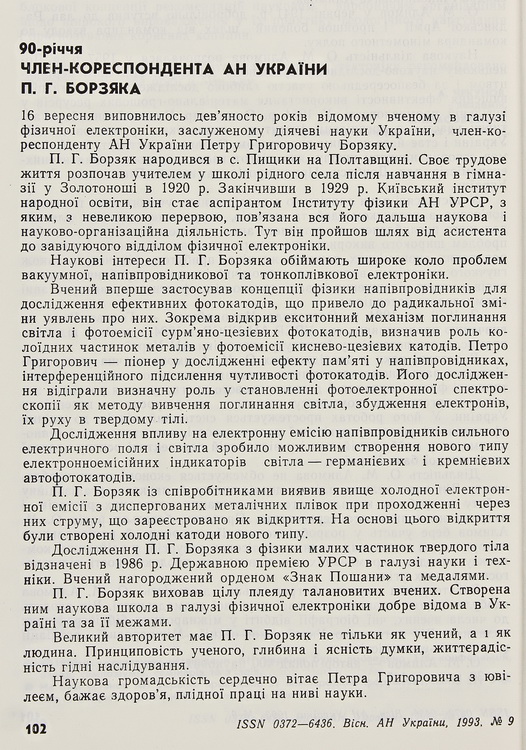 Завершує експозицію стаття «90-річчя члена-кореспондента АН України П. Г. Борзяка», приурочена до ювілею ученого (1993).