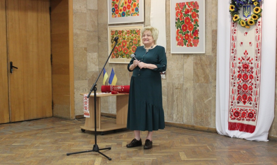 Відкриваючи виставку, завідувачка відділу соціокультурної діяльності НБУВ Антоніна Петрівна Шеремет зробила невеличкий екскурс до джерел розвитку дивовижного мистецтва петриківського розпису.