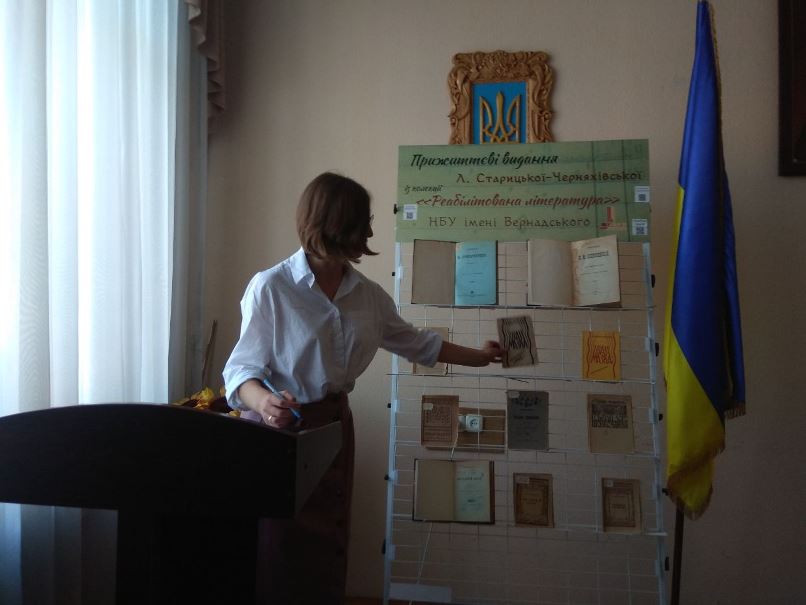 Л. Старицька-Черняхівська – одна з активних членів Української Центральної Ради (що досі залишається мало дослідженим) та потужна громадська діячка, представниця модерної української драматургії, вдумлива театральна та літературна критикиня, мемуаристка, дочка М. Старицького та племінниця М. Лисенка (її мати – рідна сестра композитора), сподвижниця М. Грушевського у видавничій справі, подруга Лесі Українки. На конференції було представлено 12 видань її творів, які збереглися в колишньому спецсхові при НБУВ. Усі примірники мають особливі помітки цензорів та штампи бібліотек різних установ (за якими можна відтворити їхню історію), що робить ці книжкові пам’ятки унікальними. Більшість із них збереглися у державних установах України лише у двох-трьох екземплярах, деякі – в одному (так, за «Друкованим зведеним каталогом україномовної книги державних бібліотек та музеїв України, 1798–1923», лише в НБУВ є окремі видання літературознавчих праць Л. Старицької-Черняхівської про Б. Грінченка та М. Коцюбинського, зроблені як репринтні відбитки з журналу «Київська старовина»). Завдяки проєкту відділу інформаційно-комунікаційних технологій з оцифрування колишнього спецфонду НБУВ ці та інші книжкові пам’ятки з колекції «Реабілітована література» тепер представлені у вільному доступі в е-бібліотеці «Україніка».