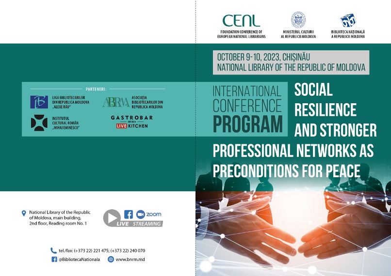 Жовтень для Національної бібліотеки України імені В.І. Вернадського став плідним на міжнародні контакти. 9-10 жовтня 2023 року в Національній бібліотеці Молдови за підтримки Міністерства культури Республіки Молдова та CENL (Конференція європейських національних бібліотек) відбулася міжнародна конференція "SOCIAL RESILIENCE AND STRONGER PROFESSIONAL NETWORKS AS PRECONDITIONS FOR PEACE" («Соціальна стійкість та міцні професійні мережі як передумови для миру»). Делегацію від Національної бібліотеки України імені В. І. Вернадського представили онлайн генеральна директорка Любов Дубровіна, директор Інституту інформаційних технологій Катерина Лобузіна та т.в.о. завідувачки відділу міжнародної інформації та зарубіжних зв'язків Людмила Дем'янюк.