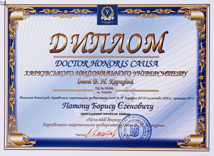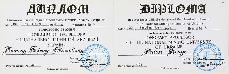 почесний доктор Вищої технічної школи у м. Хемніц (1981, Німеччина), Київського національного університету імені Тараса Шевченка (1994), Національного технічного університету України «Київський політехнічний інститут імені Ігоря Сікорського» (1998), Харківського державного політехнічного університету (1998), Таджицького державного національного університету (2001), Національного авіаційного університету (2002), Грузинського технічного університету (2005) та ін.