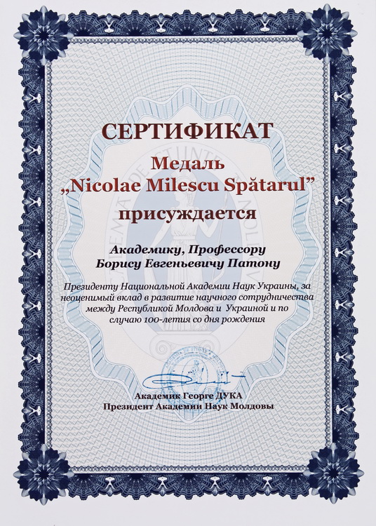 Борис Євгенович Патон (27.11.1918 – 19.08.2020) – видатний вчений у галузі електрозварювання, металургії та технології металів, організатор науки, державний та громадський діяч, доктор технічних наук (1952), академік (1958), заслужений діяч науки і техніки України (1968), президент (1962–2020) НАН України. Народився у Києві в сім’ї професора, завідувача кафедри мостів Київського індустріального інституту (нині – Національний технічний університет України «Київський політехнічний інститут імені Ігоря Сікорського») Євгена Оскаровича Патона, у майбутньому дійсного члена та віцепрезидента АН УРСР, та Наталії Вікторівни Патон (у дівоцтві – Будде).