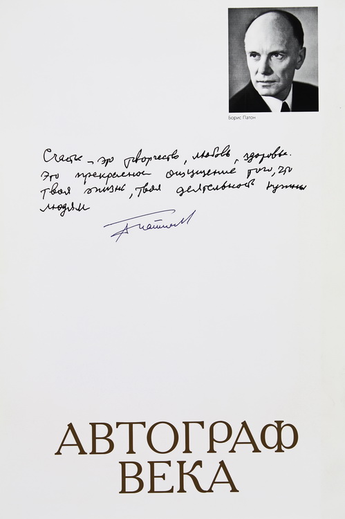 З біографічних документів Б. Є. Патона представлено витяг з протоколу Загальних зборів АН УРСР про обрання академіка Б. Є. Патона президентом АН УРСР від 27 лютого 1962 р.; документи, що свідчать про вітчизняні та іноземні нагороди вченого від вищих органів влади, закладів вищої освіти, державних та громадських установ і організацій. Серед експонатів звертає на себе увагу інформація про зірку Boris Paton від Державного космічного агентства України (2009) та власноручний напис Б. Є. Патона з визначенням «щастя», який позиціонується як автограф століття (2018).
