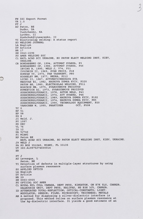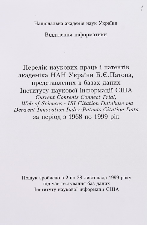 Наукову діяльність презентують фрагменти з монографій, статей, доповідей, робочих матеріалів та патент на винахід вченого. Представлено також перелік наукових праць і патентів Б. Є. Патона, вміщених в базах даних Інституту наукової інформації США за 1968–1999 рр.