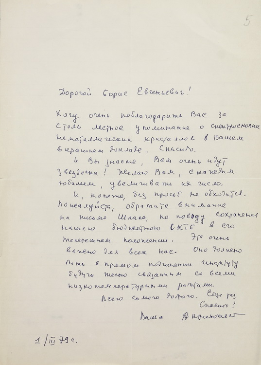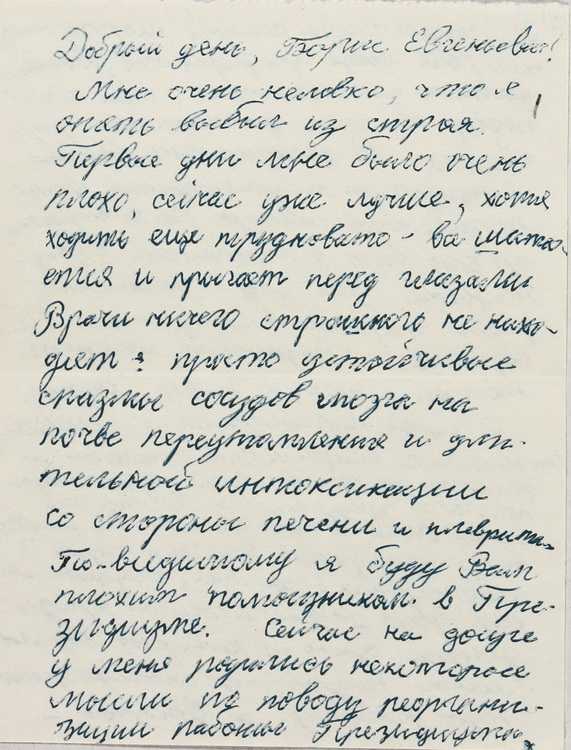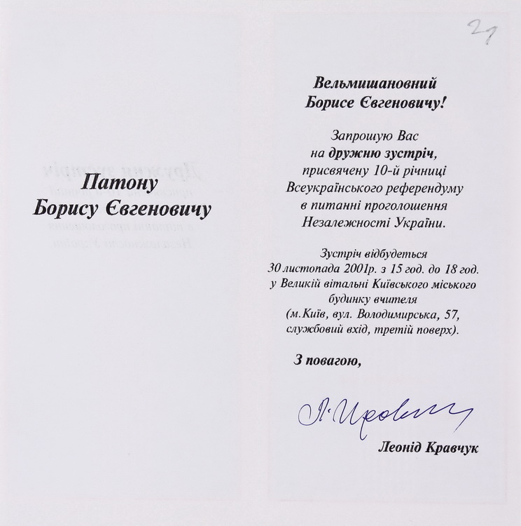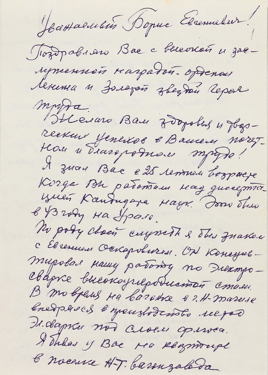 Епістолярна спадщина представлена листуванням Б. Є. Патона з представниками наукових та літературних кіл. Серед приватної кореспонденції маємо також лист шкільної вчительки Б. Є. Патона на його 60-річчя.