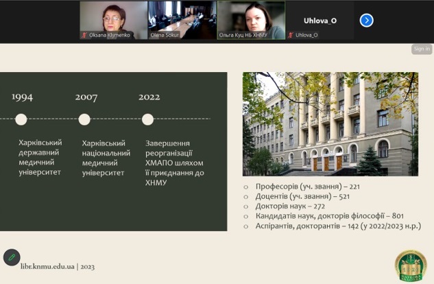 Надзвичайно інформативним був виступ завідувачки сектору інформаційно-аналітичної роботи інформаційно-бібліографічного відділу Наукової бібліотеки Харківського національного медичного університету Ольги Куц «Наукометричний та аналітичний супровід публікаційної діяльності університету в роботі наукової бібліотеки Харківського національного медичного університету». Доповідачка докладно розповіла про історію розбудови цього одного з найстаріших закладів вищої освіти в Україні, окремо зупинившись на інформаційно-аналітичній підтримці та супроводі науково-публікаційної діяльності науковців Університету.