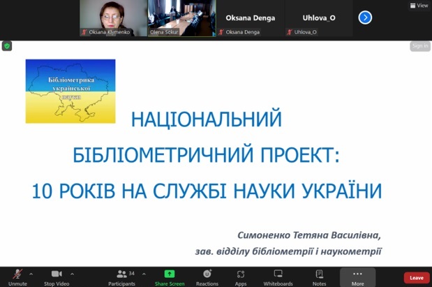 Змістовною й цікавою була доповідь завідувачки відділу бібліометрії та наукометрії Інституту інформаційних технологій НБУВ, кандидатки наук із соціальних комунікацій Тетяни Симоненко «Національний бібліометричний проєкт: 10 років на службі науки України». Наголошено, що цей проєкт виступає потужним загальнонаціональним інструментом для популяризації наукового доробку українських учених у світі. Створена фахівцями Національної бібліотеки України імені В.І. Вернадського інформаційно-аналітична система «Бібліометрика української науки» дає можливість отримати інформацію щодо представництва публікацій українських учених у професійних профільних виданнях, насамперед тих, що індексуються в зарубіжних наукометричних базах даних Scopus, Web of Science, Google Scholar.
