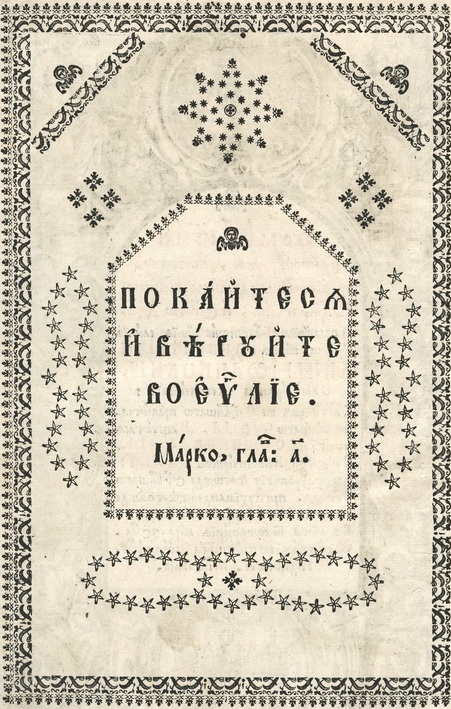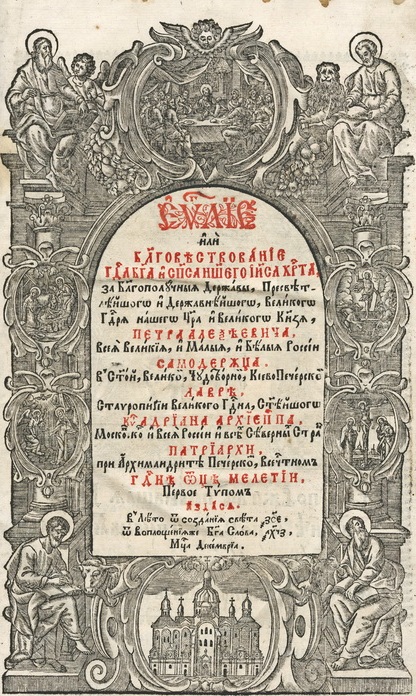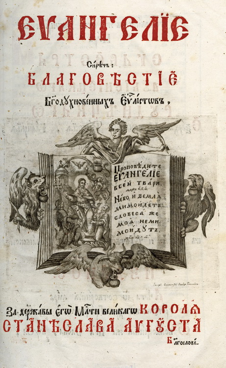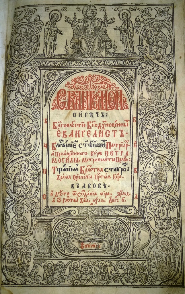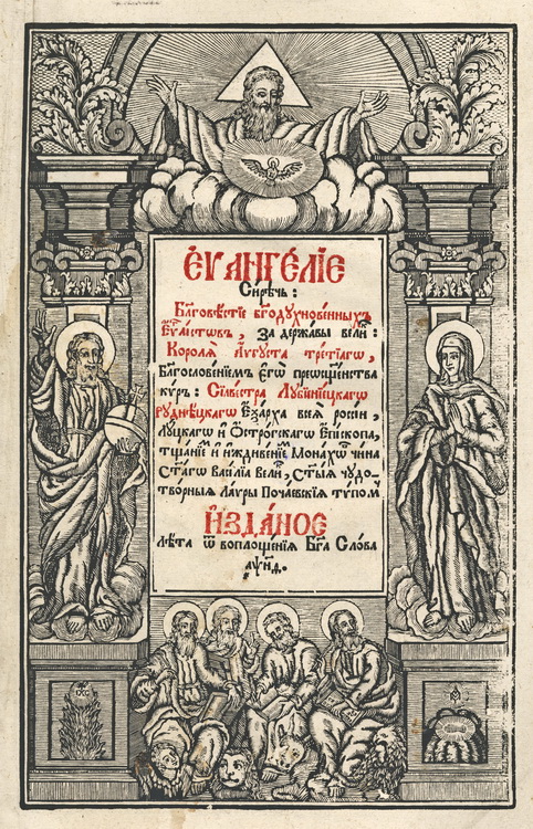 Титульний аркуш першого в українському друкарстві Євангелія 1636 р. друкарні Львівського братства оздоблено гравірованою рамкою (фортою) із іконостасною композицією, що зображає Спаса Вседержителя на престолі та дванадцять апостолів, постаті яких обвито пагонами виноградної лози (іл. 1). Цей титульний аркуш став обов’язковим атрибутом оформлення усіх подальших перевидань Євангелія, що виходили в друкарні Львівського братства протягом XVII – першої половини XVIII ст. Титульний аркуш першого києво-печерського видання Євангелія 1697 р. прикрашено фортою із зображенням постатей чотирьох євангелістів та п’яти ключових сцен із життя Ісуса Христа: Благовіщення, Різдва, Тайної Вечері, Розп’яття та Воскресіння (Іл. 2). Такий самий титульний аркуш спостерігаємо в оформленні київських Євангелій 1712 р. та 1733 р. Титульний аркуш першого великоформатного почаївського Євангелія 1759 р. оздоблює архітектурна композиція із зображенням Бога-Отця (вгорі), що променями Святого Духа осяює постать Христа Вседержителя (ліворуч), Діви Марії (праворуч) та чотирьох євангелістів (внизу) (Іл. 3). У виданні почаївського великоформатного Євангелія 1771 р. на зміну багатокомпонентним зображенням, об’єднаним гравірованою рамкою, в оформленні титульного аркуша використано гравюру із символіко-алегоричним зображенням розгорнутої книги. З чотирьох боків цю книгу тримають тетраморфи (ангел, лев, телець, орел), кожен з яких символізує відповідного євангеліста. На одній стороні розгорту книги вміщено постать Христа, що проповідує Слово Боже, а іншій – цитати, в яких підкреслено проповідницьку місію Спасителя: «Проповідите Євангеліє всей тварі» та «Небо і земля мимо ідет. Словеса же моі не мимо ідут» (Іл. 4).