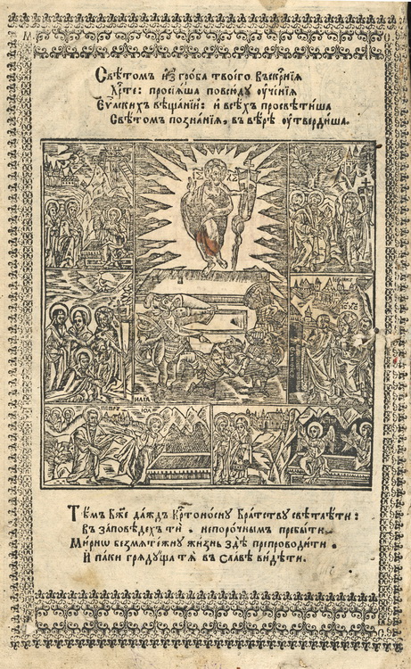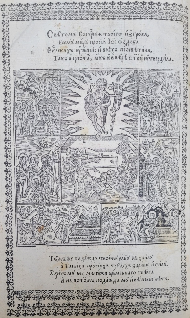 Продуктивним варіантом оформлення звороту титульного аркуша для львівських Євангелій XVII ст. стало використання багатопланової гравюри із сюжетом Воскресіння та супровідним поетичним текстом. У перевиданнях львівського братського Євангелія 1644 р. і 1670 р. бароковий поетичний текст до гравюри оспівує Воскреслого Христа, порівнюючи світло від Воскресіння зі світлом євангельського вчення. В заключних рядках цього молитовного вірша висловлюється прохання про добробут і спасіння братчиків як видавців книги (іл.9). Ідентичну композицію, проте з дещо зміненим текстом епіграми спостерігаємо в оформленні звороту титульного аркуша Євангелія Михайла Сльозки 1665 р. В останніх рядках вірша замість молитви за братчиків висловлено прохання про здоров’я, добробут та спасіння раба Божого Михаїла, тобто, – друкаря книги (іл.10).