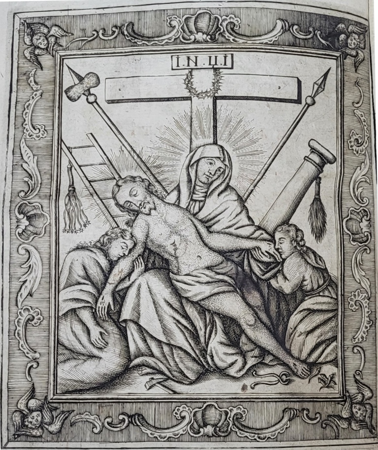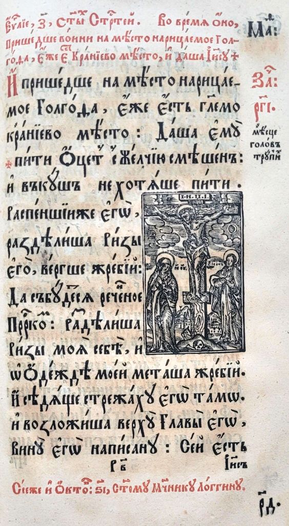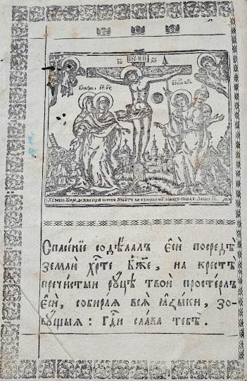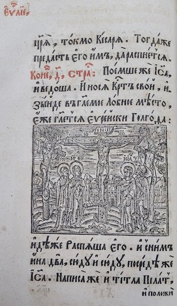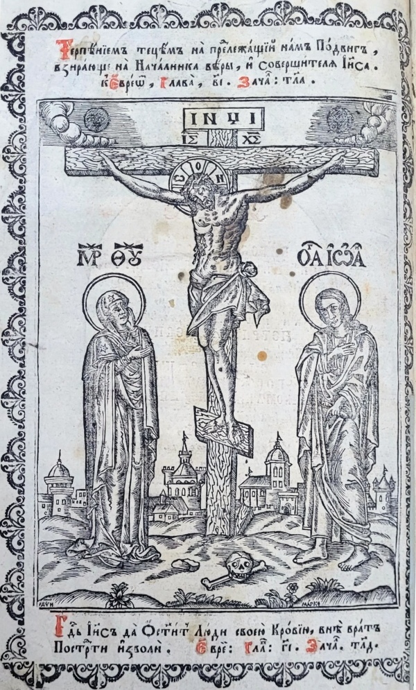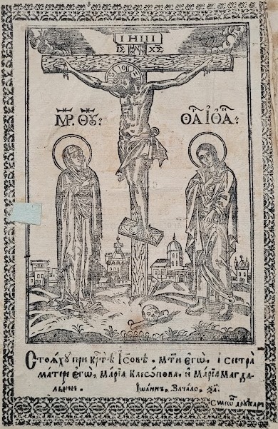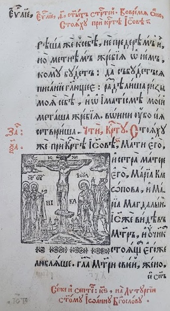 Продуктивним для оформлення зворотів титульних аркушів видань Євангелія був сюжет Розп’яття. Гравюру Розп’яття із предстоячими Дівою Марією та Іоанном Богословом на звороті титульного аркуша львівського братського Євангелія 1690 р. вербально доповнено цитатою, що апелює до зображення, проте називає інші образи предстоячих – Марію Клеопову та Марію Магдалину (іл.11). Аналогічне зображення спостерігаємо в якості фронтиспісної гравюри на звороті титульного аркуша києво-печерського видання Євангелія 1712 р., супровідний текст для якого наголошує на ролі жертви Христа (Іл. 12). Роздуми над жертвою Христа висловлено і в піснеспіві, який супроводжує багатопланову гравюру із сюжетом смерті Спасителя на хресті, вміщену на звороті титульного аркуша останнього львівського видання Євангелія XVIII ст. – 1743 р. (іл.13). Довершеним витвором книжкової графіки стала гравюра із зображенням Богородиці, що тримає на руках знятого з хреста Спасителя, використана в якості оздоблення звороту титульного аркуша почаївського Євангелія 1780 р. (Іл. 14).