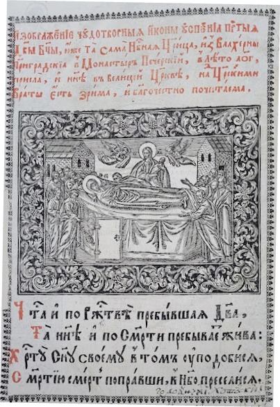 Образ Ісуса Христа займає центральну роль в композиції гравюр із сюжетом Успіння Богородиці, який часто використовувався в оформленні зворотів титульних аркушів українських кириличних стародруків. У виданнях Києво-Печерської лаври та Львівського братства гравюра Успіння використовувалася в якості емблеми друкарні. В київському Євангелії 1697 р. на звороті титульного аркуша спостерігаємо чудотворну ікону Успіння Богородиці, де Христа із немовлям-Богородицею на руках зображено біля труни Пречистої. Ця композиція супроводжується віршем «Чистая і по Рождестві пребившая Діва» (Іл. 15). У львівському контрафактному виданні Євангелія 1704 р., у вихідних даних якого вказано дату 1690 р., зворот титульного аркуша прикрашає гравюра із сюжетом Успіння, де Христос з Богом-Отцем та Святим Духом, зображені на хмарах над труною Богородиці, одягають вінець вічної слави взятій на небо Діві Марії (Іл.16).