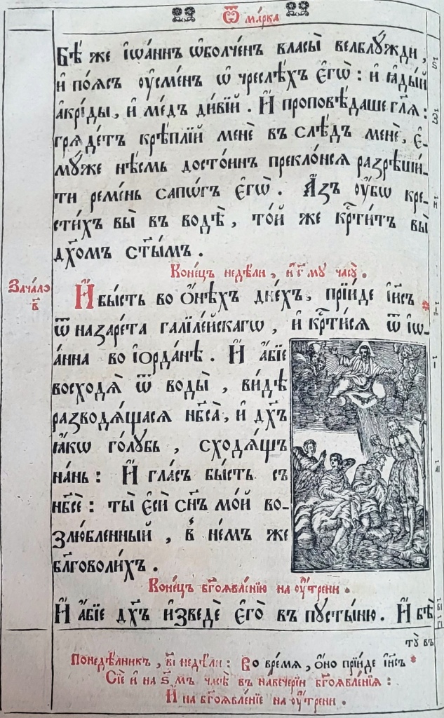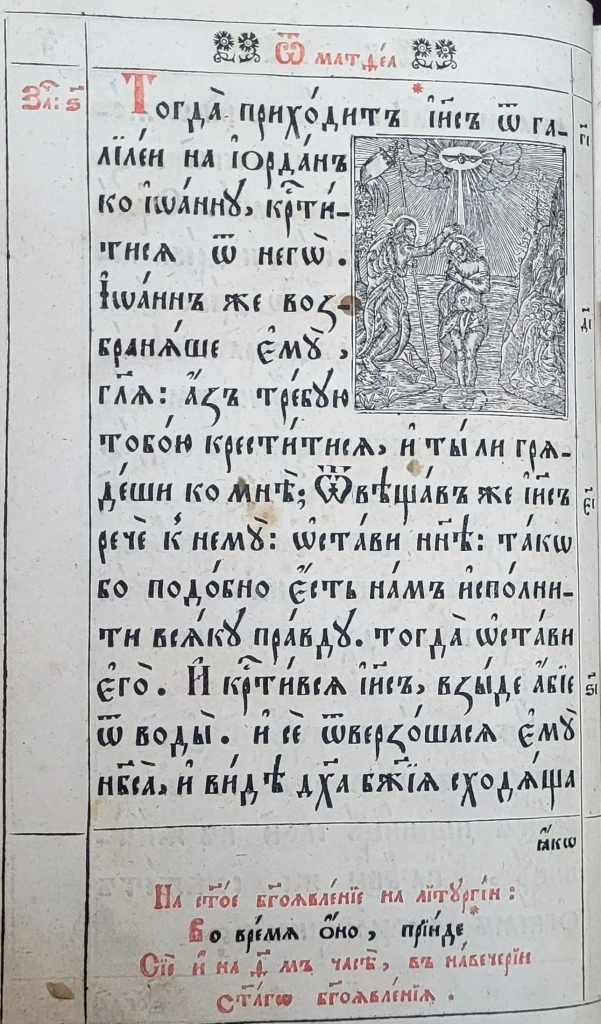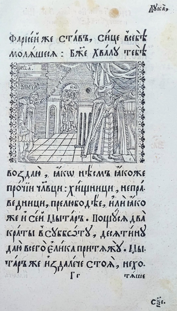 Постійним елементом архітектоніки львівських та київських видань Євангелія була молитовна присвята Ісусові Христу. Зокрема, у перше львівське Євангеліє 1636 р. було введено присвяту до Спаса Вседержителя, початок якої виділено по-бароковому розлогим заголовком, сформованим з іменувань-славлень Ісуса Христа (іл.17). Із незначними змінами текст цієї присвяти повторювався у перевиданнях 1670 р., 1690 р. та 1704 р., а у виданні 1722 р. замість повного тексту було використано лише заголовок присвяти до Спаса Вседержителя (іл. 18).