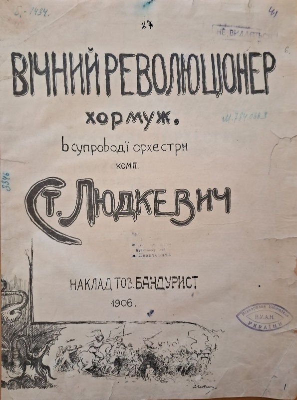 Початкові спроби композитора були пов’язані з хоровими жанрами, обробками народних пісень, солоспівами. У 1896 році в Перемишлі було вперше виконано хор юного Людкевича. Це був хор «Пожар» на вечорі пам’яті Адама Міцкевича. Як писав А. Кос-Анатольський, «справжня патріотична поезія знайшла музичний відгук в душі композитора, котрий вболіває за долю свого народу. Це задушевні звернення серця, сповненого любові до людей і життя, до добра і краси» [3, с. 3]. Серед перших творів композитора постав також твір 19-річного Людкевича «Вічний революціонер» на слова Івана Франка, написаний і виконаний 1898 року до 25-річчя творчої діяльності Каменяра. «Вічний революціонер» – чоловічий хор з супроводом фортепіано або симфонічного оркестру, виданий у Львові 1899 у ювілейному збірнику під заголовком «Зів’ялі листки». У другій редакції (1904) хор перевидано 1906 року у Львові [Фото 2]. У тогочасній пресі хор згадується під заголовком «Пісня побіди». «Вічний революціонер» – це другий за хронологією твір раннього Людкевича, що дійшов до нашого часу.