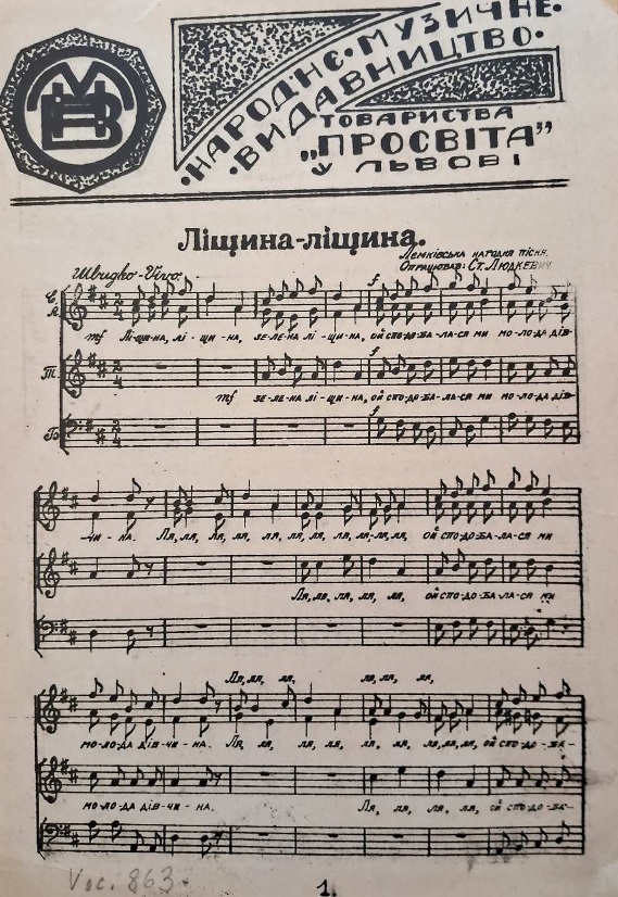 Станіслав Людкевич – відомий майстер хорових обробок народних пісень (їх понад 100) для чоловічого, мішаного та жіночого хорів, які набули великої популярності, публікувалися та виконувалися хоровими колективами. На думку М. Бойко, «обробки С.П. Людкевичем народних пісень для солоспіву та терцету являються зразком вокальної літератури. Вони показують художню якість його оригінальної, неповторної індивідуальності як композитора, не втрачають по сьогоднішній день своєї чарівності та популярності» [1, с.2]. Відомо, що митець брав участь у багатьох фольклорних експедиціях та здійснив численні обробки народних пісень, зокрема «Балада про Бондарівну», «А із ночі, із вечора», «Ой по горі, горі, «Котилася та зоря із неба», «Їхав стрілець» та ін. На виставці представлено яскраву етнічну самобутню пісню: «Ліщина-ліщина» [Фото 8].