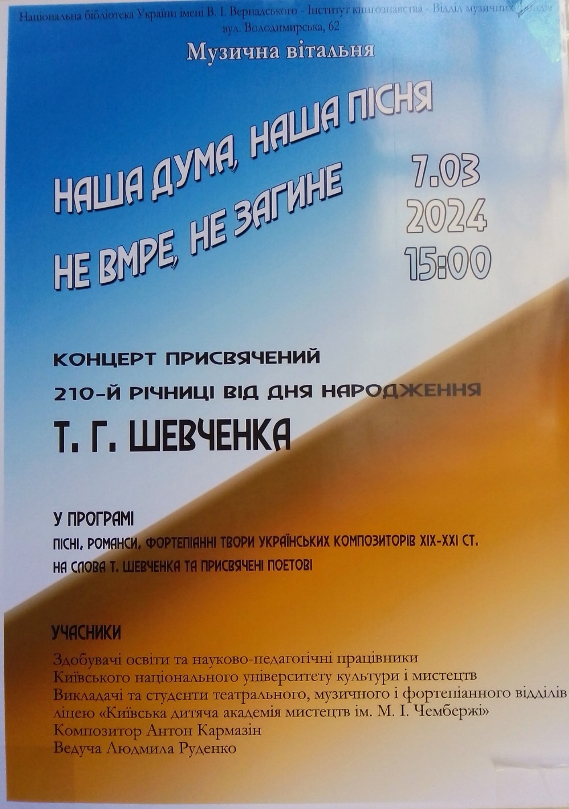 Участь у концерті брали здобувачі освіти та науково-педагогічні працівники освітньо-професійної програми «Диригентсько-хорове мистецтво («академічне») факультету музичного мистецтва Київського національного університету культури і мистецтв та викладачі й студенти театрального, музичного і фортепіанного відділів ліцею «Київська дитяча академія мистецтва імені М. І. Чембержі». Чудові композиції виконали Лев Білостоцький, Олександр Кравчук, Юрій Казанцев, Микола Кришев, Олексій Ряжко, Єлизавета Лялько, Дмитро Кундеус, Іванна Дерека. Звучали твори, що були написані ще у позаминулому столітті. Та цього дня відбулась і прем’єра – у виконанні Наталії Скринник прозвучав твір сучасного українського композитора Антона Кармазіна на слова В. Усова «Терновий мед».