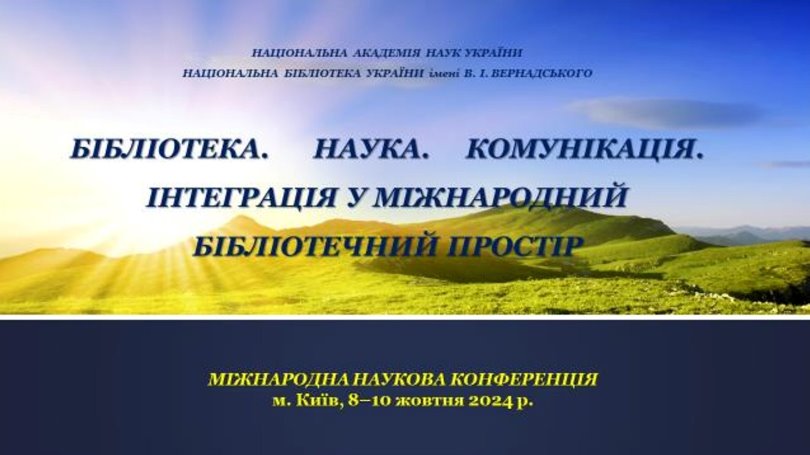 Національна бібліотека України імені В. І. Вернадського запрошує Вас взяти участь у роботі Міжнародної наукової конференції «Бібліотека. Наука. Комунікація. Інтеграція у міжнародний бібліотечний простір», м. Київ, 8-10 жовтня 2024 року.