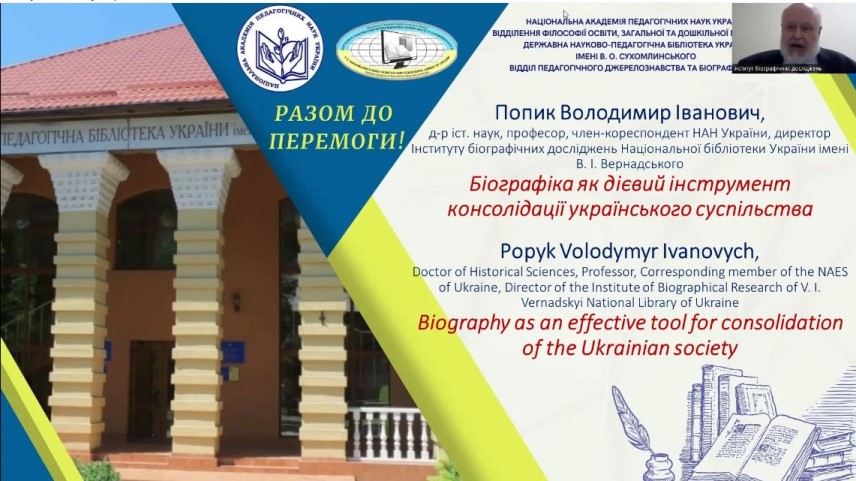 Напередодні Дня біографа, 13 травня, науковці Інституту біографічних досліджень взяли участь в організованій Державною науково-педагогічною бібліотекою України імені В. О. Сухомлинського ІХ Всеукраїнській науково-практичній конференції з історії освіти з міжнародною участю «Педагогічна біографіка про національно-патріотичне виховання дітей і молоді: ідеї, концепції, практики» (https://dnpb.gov.ua/ua/?events=39407). На ній директор інституту доктор історичних наук член-кореспондент НАН України Володимир Попик виступив з доповіддю програмного спрямування «Біографіка як дієвий інструмент консолідації українського суспільства». Доповіді завідувачки відділу теорії та методики біобібліографії кандидата історичних наук Надії Любовець «Спогади у період війни як ресурс консолідації суспільства: досвід та сучасні практики» й кандидата філологічних наук Оксани Плющик «Репрезентація біограм/біографій/наративів захисників України: контент-стратегії вітчизняних бібліотек» були присвячені гостро актуальній в умовах війни проблемі місця й значення біографіки в зміцненні національно-патріотичної свідомості. У річищі обговорення завдань деколонізації українського гуманітарного простору доктор філологічних наук Галина Александрова виголосила доповідь «О. М. Бодянський і М. І. Стороженко: комунікація педагога і студента», кандидат історичних наук Вікторія Патик – повідомлення «Особовий архівний фонд історика та педагога Михайла Івановича Лілеєва», кандидат філологічних наук Оксана Шалак – «Анатоль Свидницький (1834–1871) як педагог: джерела до реконструкції біографії».