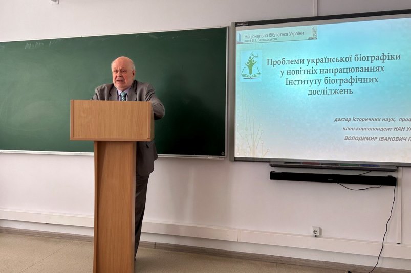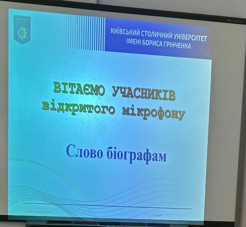 На запрошення колег з Київського столичного університету імені Бориса Грінченка науковці Інституту провели зустрічі з викладачами і студентами, представлено наукові доповіді та презентації з актуальної дослідницької проблематики. 16 травня завідувач відділу теорії і методології біобібліографії Надія Любовець виступила з лекцією «Українські мемуари: комунікативний та джерелознавчий вимір» перед студентами спеціальності «Біографістика і текстологія» (http://surl.li/twxzs). 22 травня в межах заходу «Відкритий мікрофон» – «Слово біографам» перед студентами та їхніми викладачами (http://surl.li/twydj) виступили з доповідями «Проблеми української біографіки у новітніх напрацюваннях Інституту біографічних досліджень» член-кореспондент НАН України, доктор історичних наук Володимир Попик, «Спогади у сучасних вимірах: комунікативні практики» кандидат історичних наук Надія Любовець, «Практика сайтів освітніх закладів у представленні інформації про загиблих захисників України» кандидат філологічних наук Оксана Плющик. Провівши того ж дня майстер-клас «Поліфонія біографічного простору: сучасні моделі реконструкції життєпису» з акцентом на сучасній дитячій біографічній книжці, кандидат історичних наук Наталя Марченко надала студентам практичні рекомендації з написання життєписів, зацікавила їх розкриттям нових тенденцій у вітчизняному біографічному книговиданні.