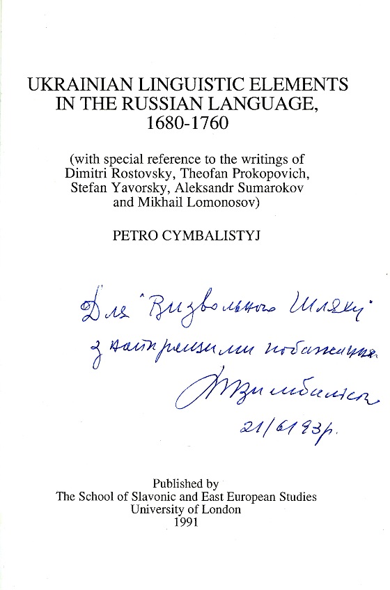 Petro Cymbalistyj: “Ukrainian linguistic elements in the Russian language, 1680-1760 (With special reference to the writings of Dimitri Rostovsky, Theofan Prokopovich, Stefan Yavorsky, Aleksandr Sumarokov and Mikhail Lomonosov)”