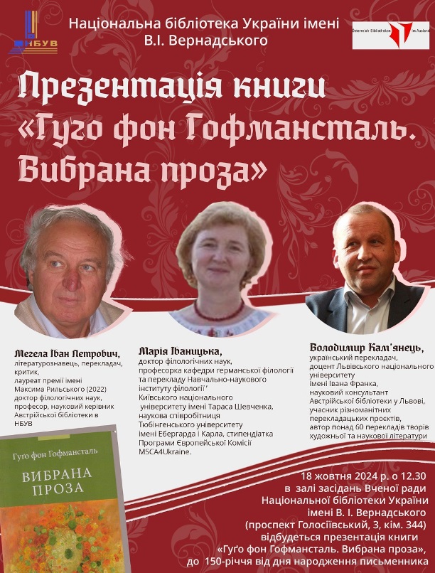 18 жовтня 2024 р. о 12.30 в залі засідань Вченої ради Національної бібліотеки України імені В. І. Вернадського (проспект Голосіївський, 3, кім. 344) відбудеться презентація книги «Гуґо фон Гофмансталь. Вибрана проза», підготованої до 150-річчя від дня народження письменника. Презентація проходитиме у змішаному форматі як офлайн, так і онлайн через платформу Zoom.
