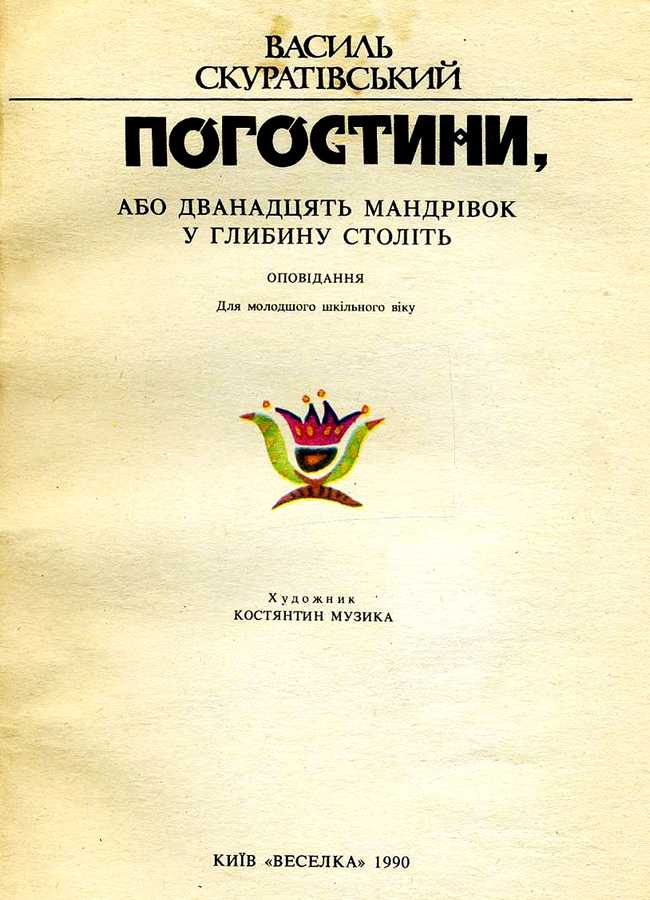 3. Погостини, або дванадцять мандрівок у глибину століть : оповідання : для мол. шк. віку / Василь Скуратівський ; худож. Костянтин Музика. – Київ : Веселка, 1990. – 126 с. : іл. – Назва обкл.: Погостини.