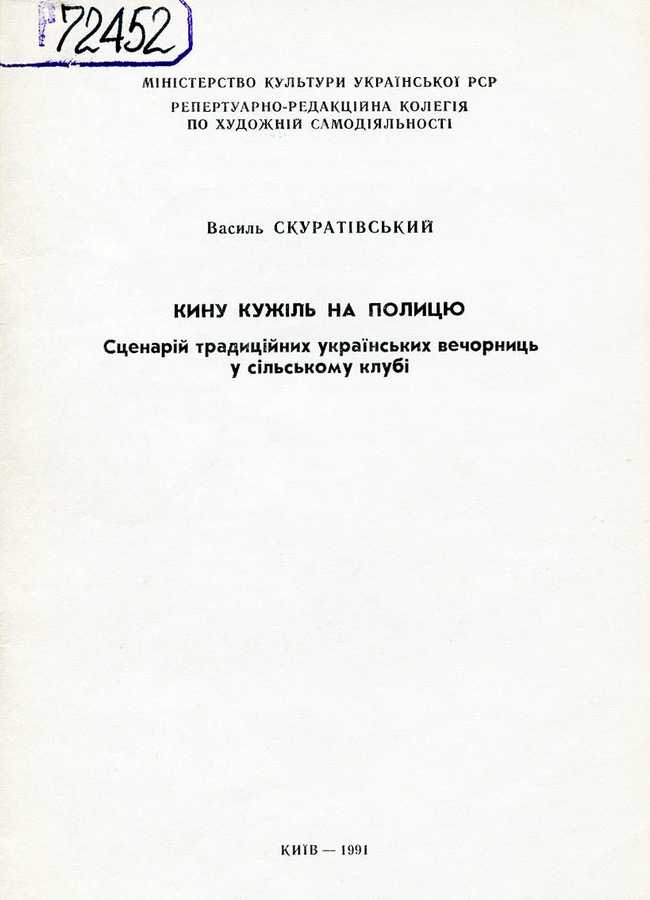 4. Кину кужіль на полицю : сценарій традиц. укр. вечорниць у сіл. клубі / Василь Скуратівський ; М-во культури УРСР, Репертуар.-редкол. по худож. самодіяльності. – Київ : 1991. – 85 с.