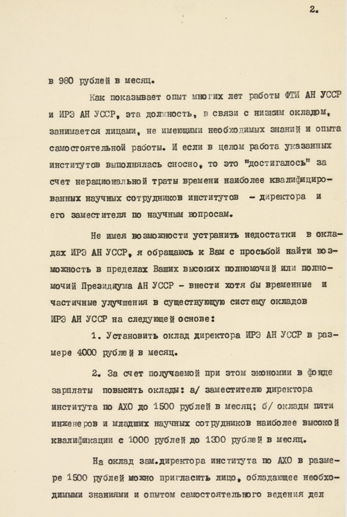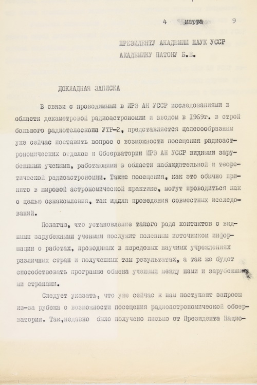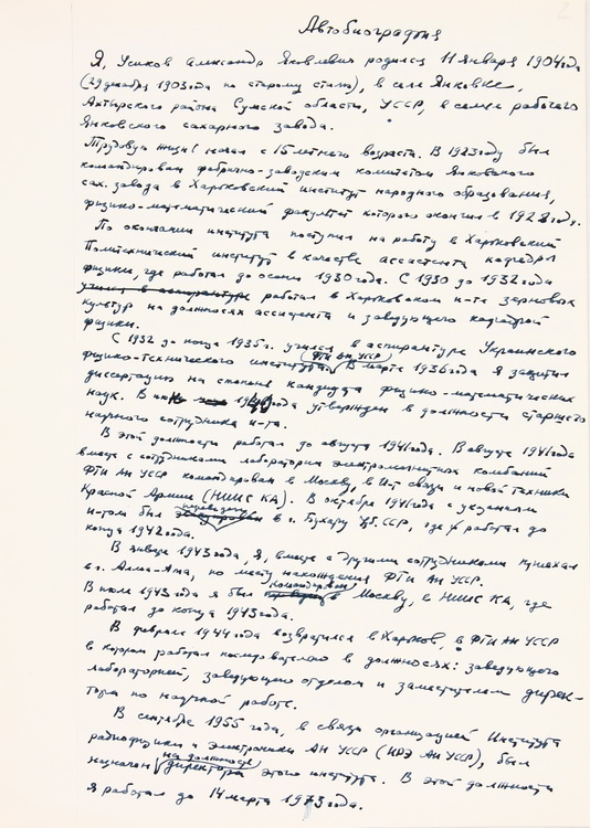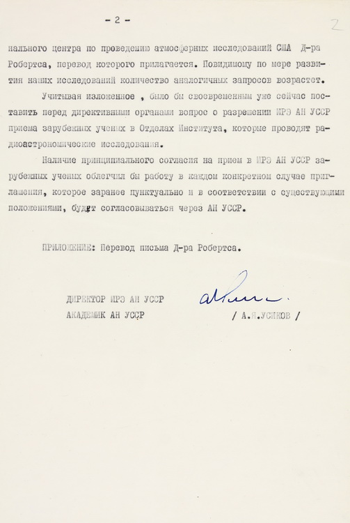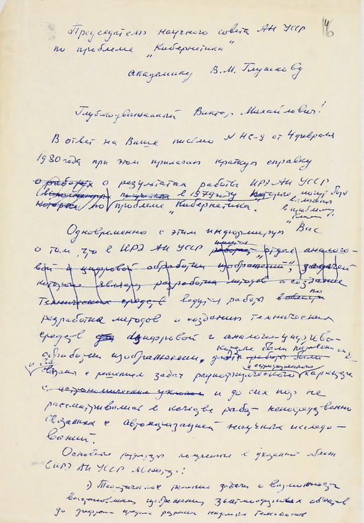 Репрезентовано лист О. Я. Усикова, як завідувача відділом обробки зображень ІРЕ АН УРСР, до голови Наукової ради АН УРСР з проблеми «Кібернетика», академіка АН УРСР В. М. Глушкова, в якому йдеться про розробку методів та створення технічних засобів цифрової та аналогової обробки зображень у відділі, який він очолював (1980).