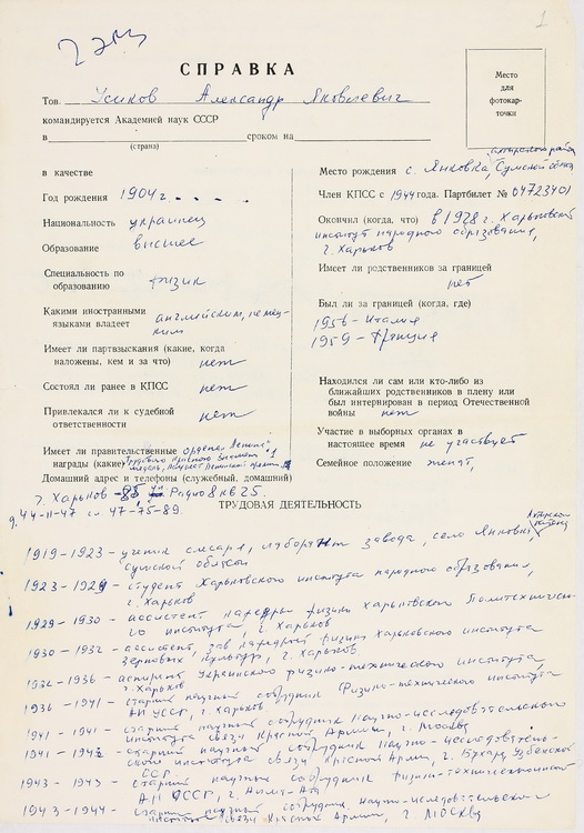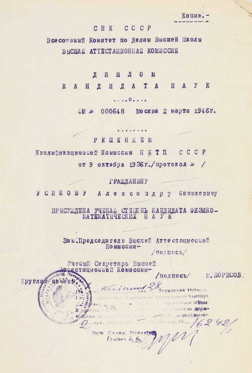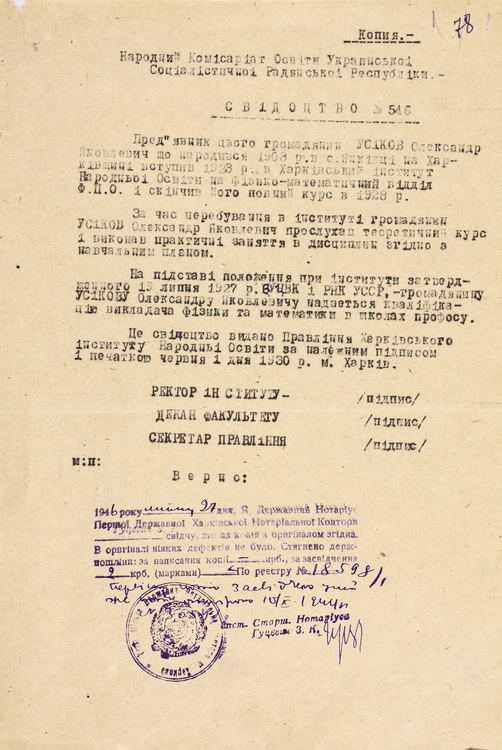 Розміщено вітальний лист від дирекції ФТІНТ АН УРСР у зв’язку із 80-річчям О. Я. Усикова (1984).