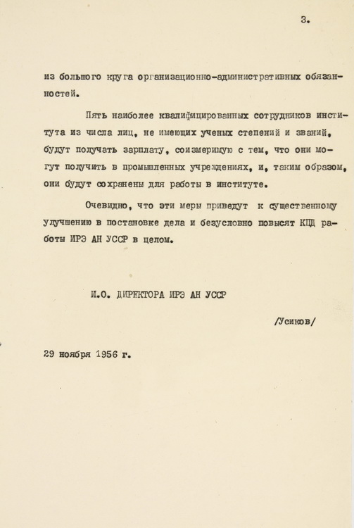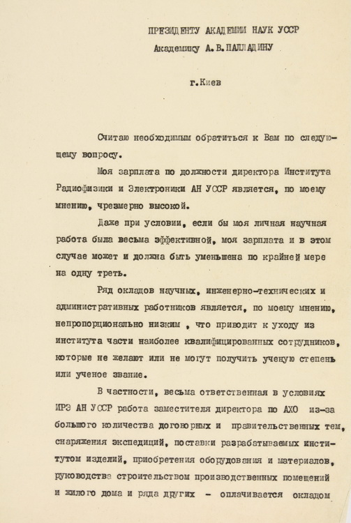 З-поміж епістолярію ученого розміщено лист директора ІРЕ АН УРСР О. Я. Усикова до академіка АН УРСР, президента АН УРСР О. В. Палладіна з проханням зменшити його оклад як директора і внаслідок цієї економії підвищити зарплату співробітників Інституту (1956).