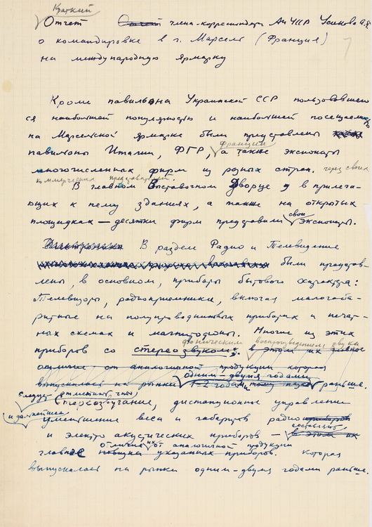 Міжнародної наукової діяльності вітчизняного дослідника стосується звіт про наукове відрядження на Марсельський міжнародний ярмарок (1959).