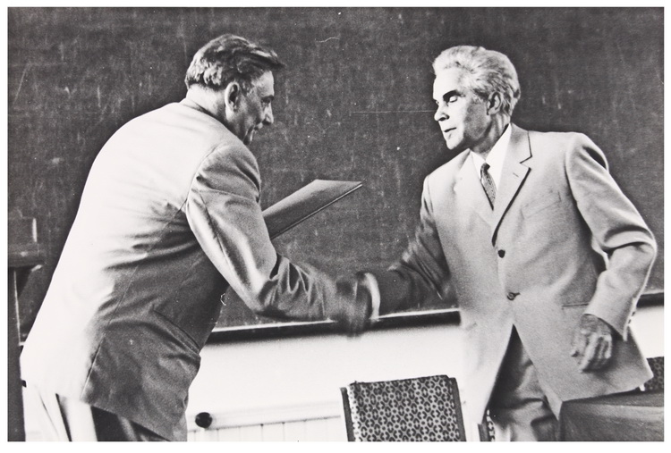Розміщено світлину, що зафіксувала О. Я. Усикова під час отримання ним, як директором ІРЕ АН УРСР, почесної грамоти від першого заступника голови Президії Верховної Ради УРСР С. О. Стеценка (1969).