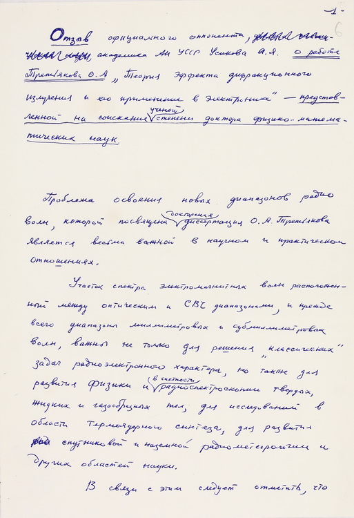 Вміщено лекцію «Циліндричний хвилевод» з навчального курсу «Мікрохвильова електродинаміка», що репрезентує науково-педагогічну діяльність ученого (1953), та відгук О. Я. Усикова, як офіційного опонента, на дисертацію, представлену на здобуття наукового ступеня доктора фізико-математичних наук О. О. Третьякова – «Теорія ефекту дифракційного випромінювання та його застосування в електроніці» (1972).