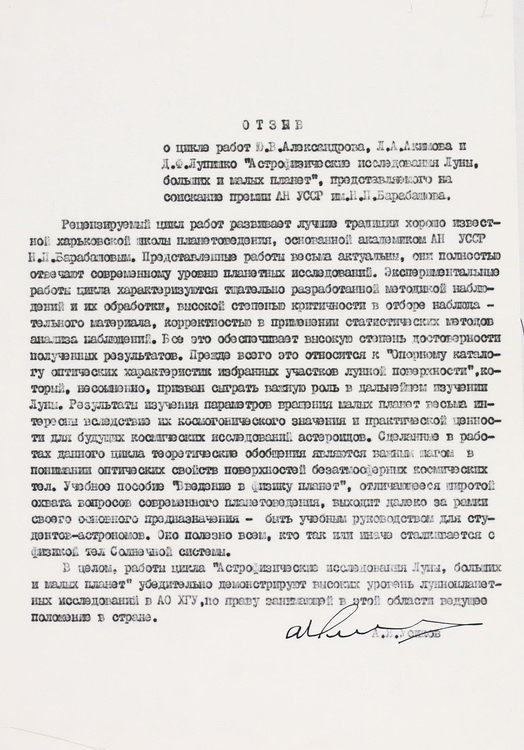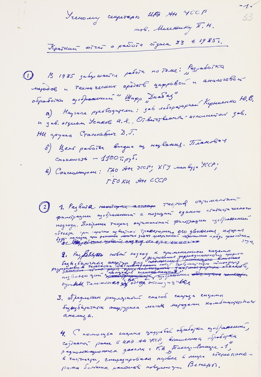 Серед документів – анотація до неопублікованої наукової праці О. Я. Усикова й Ю. В. Корнієнка «Цифрова обробка зображень в астрономії» (1981). У розвідці висвітлено методи й технічні засоби цифрової та аналого-цифрової обробки астрономічних об’єктів, котрі широко застосовувалися у відділі обробки зображень ІРЕ АН УРСР.