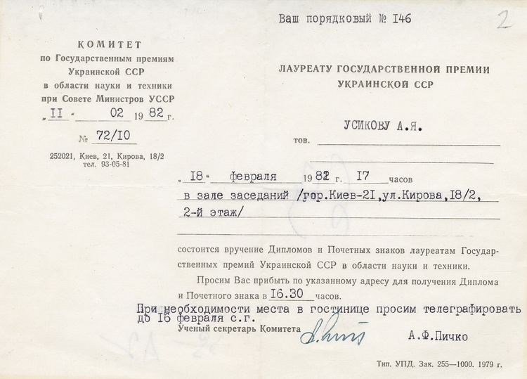 До експозиції увійшло запрошення на церемонію вручення диплому лауреата Державної премії АН УРСР в галузі науки та техніки (1982).