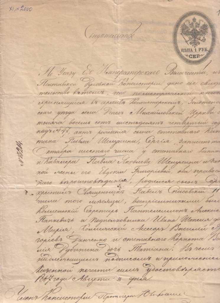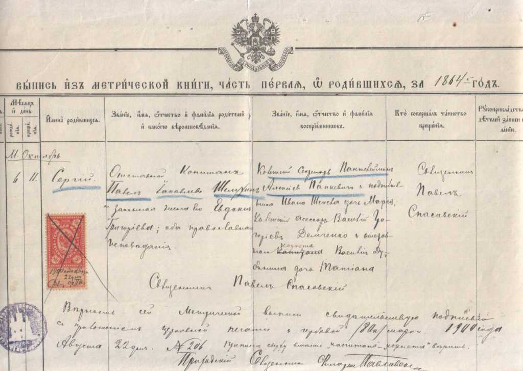 1. Свідоцтво Полтавської духовної консисторії про запис в метричній книзі Михайлівської церкви села Деньги Золотоніського повіту Полтавської губернії про народження 6 жовтня 1864 року у відставного капітана Павла Яковича Шелухина та його дружини Євдокії Григорівни сина Сергія. Оригінал. Автограф з печаткою. Полтава, 31 серпня 1867 р. (ІР НБУВ, ф. ХІ, од. зб. 2000)