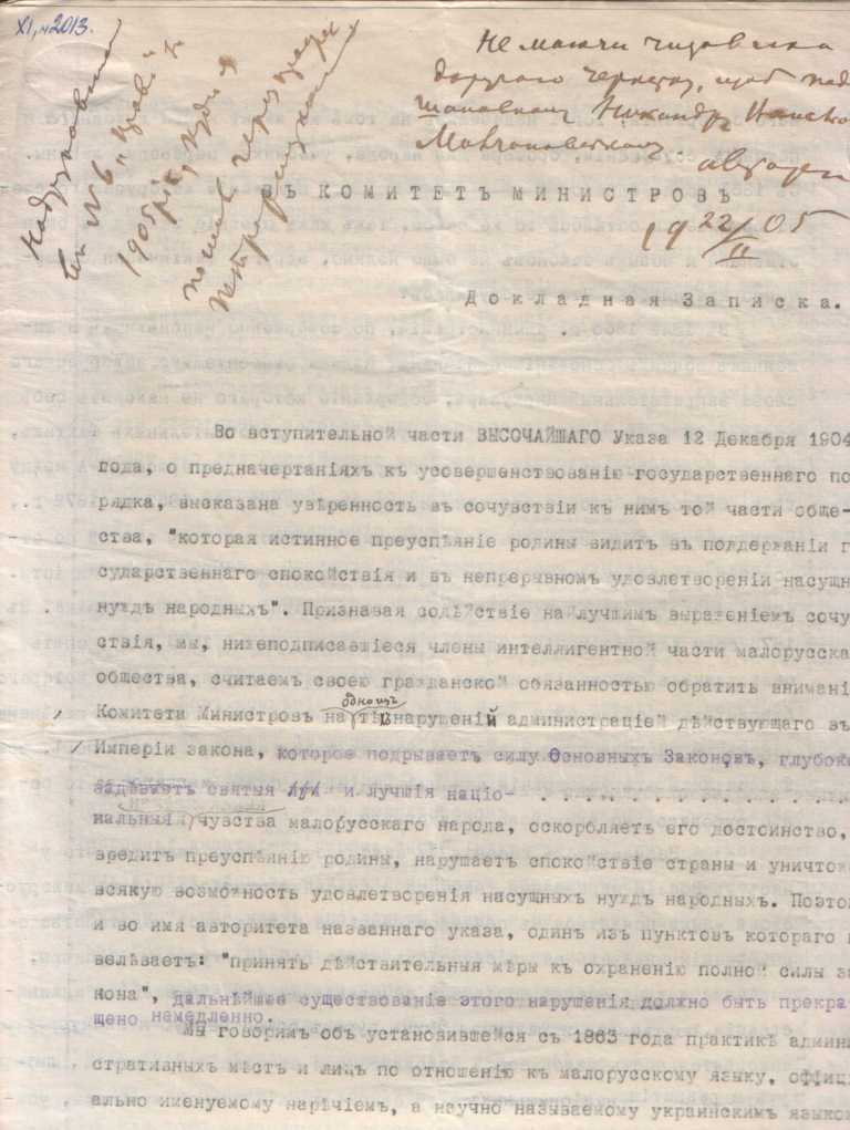 18. Шелухин С.П. – Комітету Міністрів Російської імперії. Доповідна записка про юридичні підстави надання рівних прав українській мові («малоросійському слову») та друку серед інших мов імперії. Машинопис з правками автора з дарчим написом Никандру Васильовичу Молчановському. Рос мовою. Одеса, 1905 р. На документі помітка чорнилом: «Надруковано у щотижневій юридичній газеті «Право», 1905, № 6». (ІР НБУВ, ф. ХІ, од. зб. 2013)
