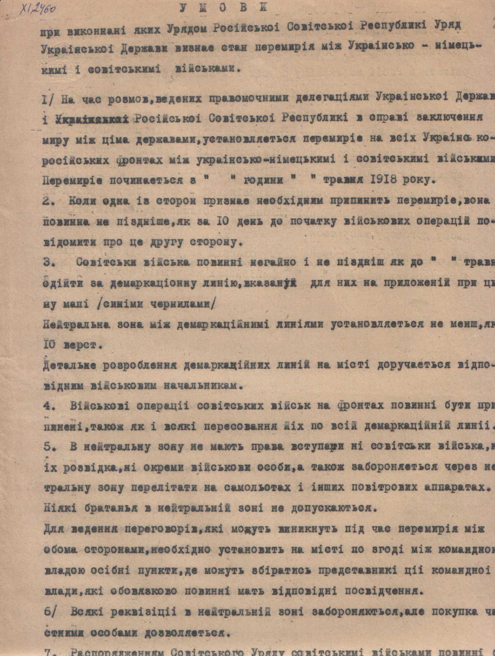 91. Умови примирення між радянськими і українсько-німецькими військами. [Київ, травень 1918] р. ІР НБУВ, ф. ХІ, од. зб. 2460)
