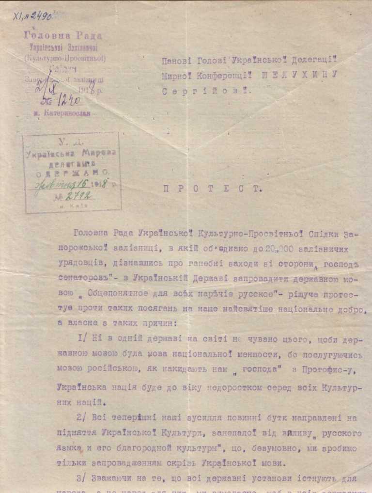 63. Протест членів Головної ради Української залізничної (культурно-просвітньої) спілки – Голові Української делегації мирної конференції С.П. Шелухину проти запровадження російської мови як державної мови на території Української Держави [Київ, 1918 р.] (ІР НБУВ, ф. ХІ, од. зб. 2490).