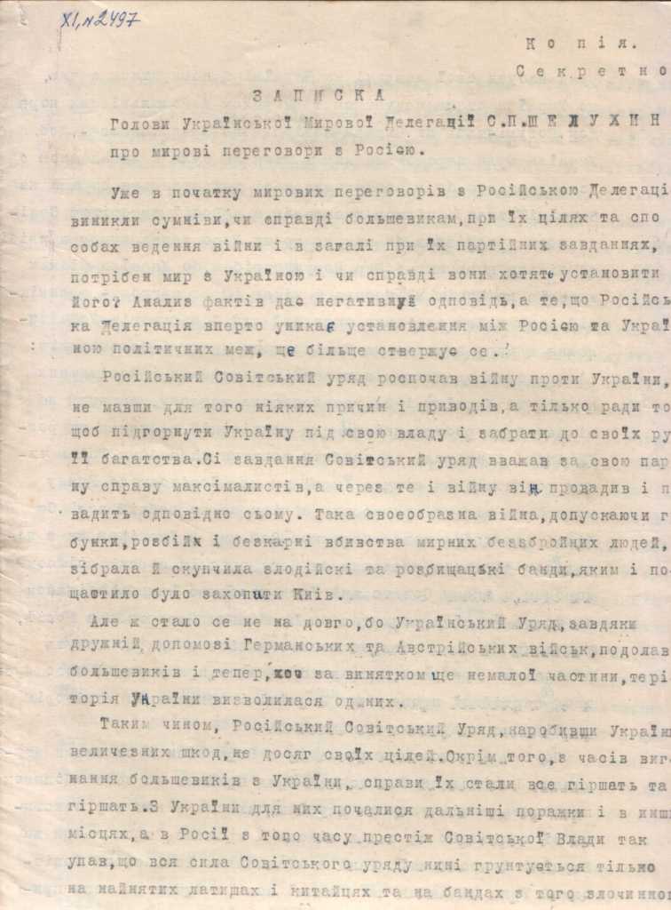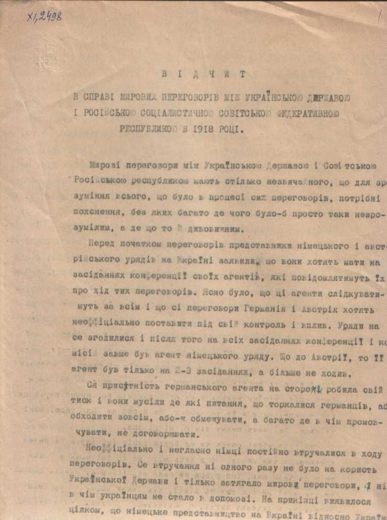61. Шелухин С.П. Звіт в справі мирових переговорів між Українською Державою і російською соціалістичною радянською федеративною республікою в 1918 р. [Київ, 1918 р.] (ІР НБУВ, ф. ХІ, од. зб. 2498)