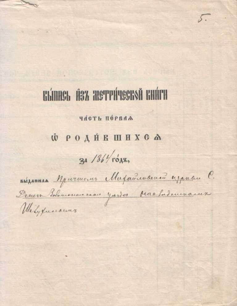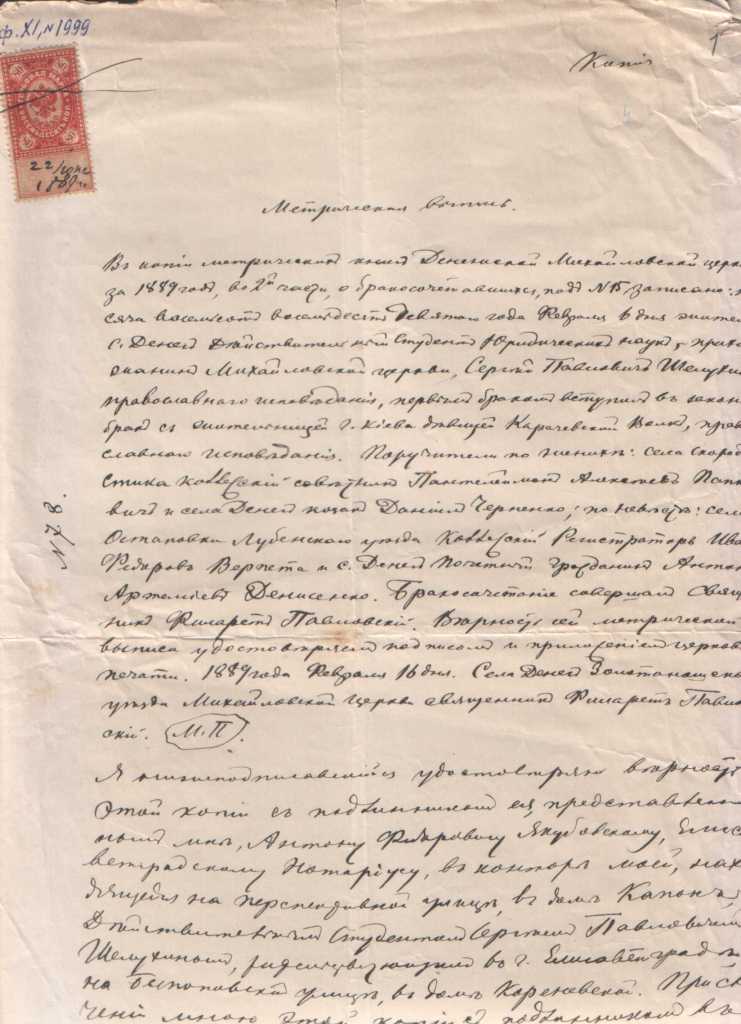 4. Метрична виписка про вінчання 6 лютого 1889 р. в Михайлівській церкві с. Деньки Золотоноського повіту Сергія Павловича Шелухина з Любов’ю Миколаївною Карачевською-Вовк). Полтава, 22 червня 1889 р. (ІР НБУВ, ф. ХІ, од. зб. 1999)