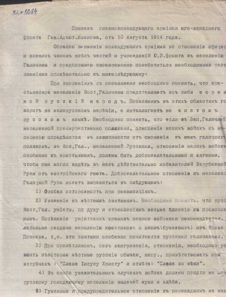 48. Наказ Головнокомандувача Південно-західним фронтом Миколи Іудовича Іванова щодо гуманного ставлення до населення Східної Галичини та військовополонених галичанам австрійської армії під час наступу в умовах Першої світової війни. Машинопис. (ІР НБУВ, ф. ХІ, од. зб. 3284)