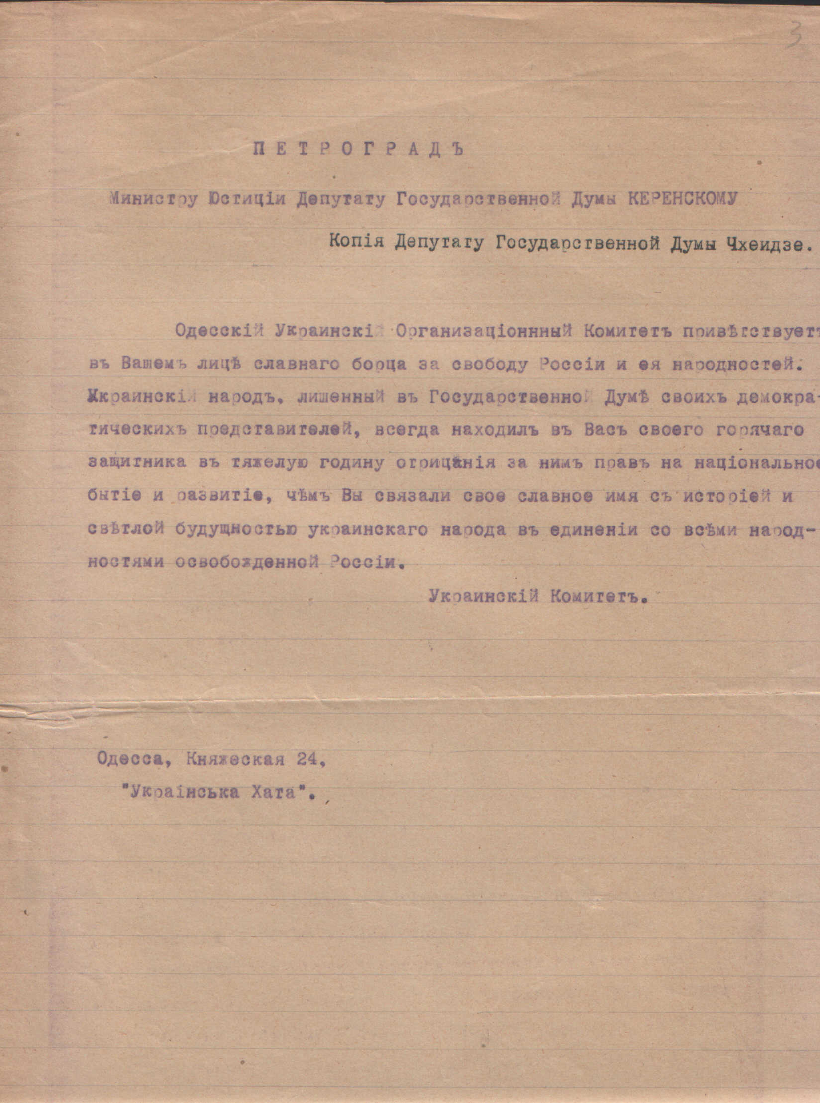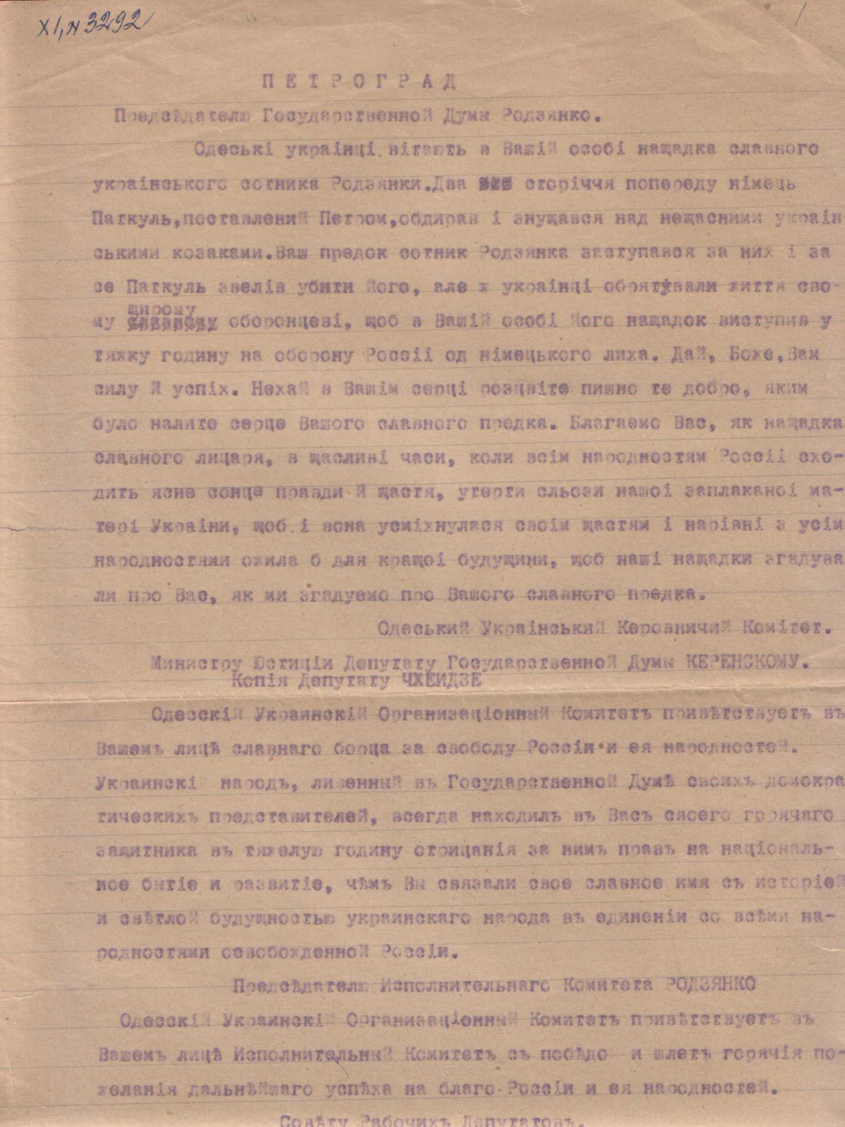 87. Одеський Український організаційний комітет – Міністру юстиції О.Ф. Керенському. Копії текстів вітальних телеграм. Одеса, березень 1917 р. (ІР НБУВ, ф. ХІ, од. зб. 3292)